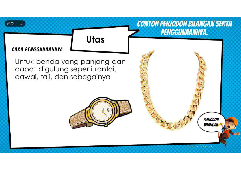Digunakan untuk benda yang berangkai seperti tali, rantai, dan sebagainya. Benda yang panjang dan berangkai seperti rantai, tali, dawai, jam tangan dan sebagainya. Tip contoh kesalahan dalam penggunaan penjodoh bilangan: Batang, benda panjang atau tinggi, sebatang sungai . Devi memakai seutas rantai emas ketika perkahwinan kakaknya. Utas penjodoh bilangan yang digunakan bagi rantai (termasuk jam tangan . · · contoh ayat : emak membeli seutas rantai emas. Angkatan, kumpulan seragam, seangkatan tentera ; Penjodoh bilangan · contoh ayat: Baris, kumpulan benda dalam bentuk garis lurus, sebaris ayat ;
